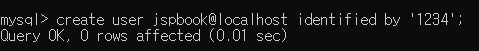create user jspbook@localhost identified by '1234';