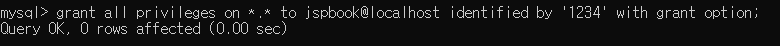 grant all privileges on *.* to jspbook@localhost identified by '1234' with grant option;