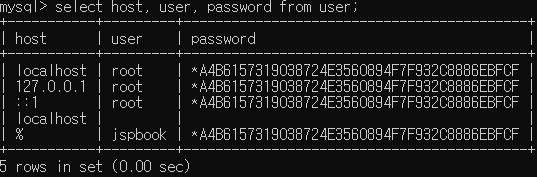 Host가 '%'인 jspbook에 모든 권한을 주고 실행해봤지만 되지 않았음.