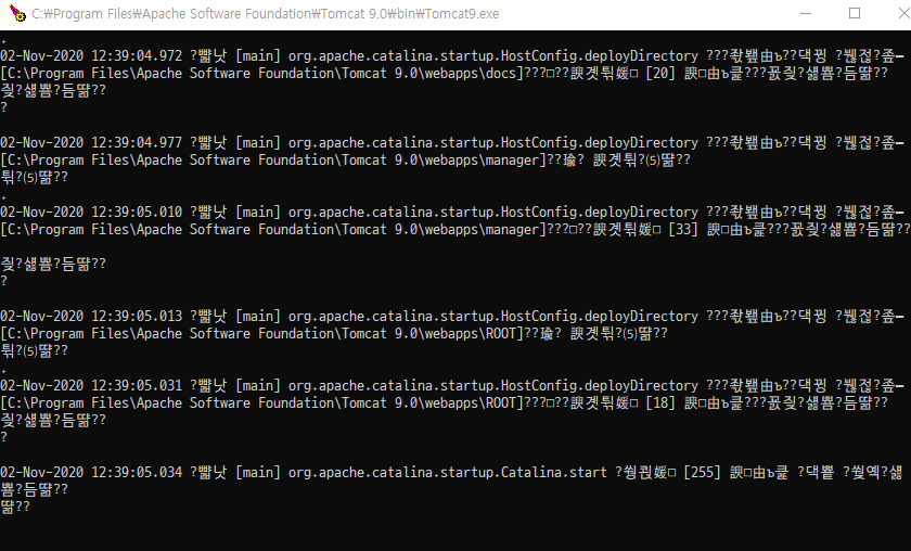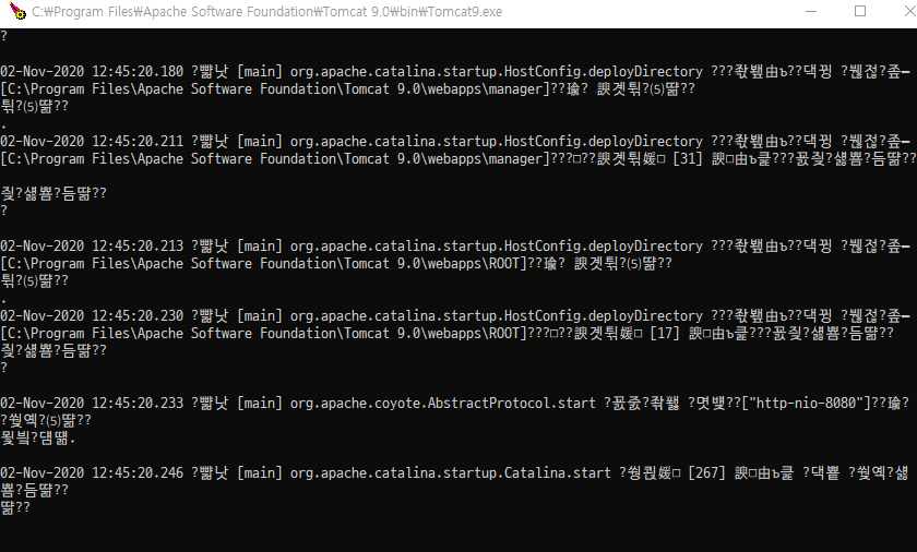 아파치 톰캣 콘솔창에 한글 인코딩이 깨져보임.