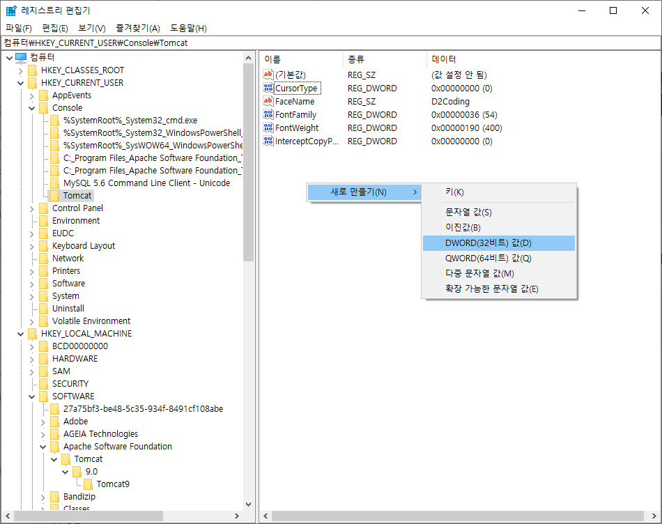 컴퓨터\HKEY_CURRENT_USER\Console\Tomcat