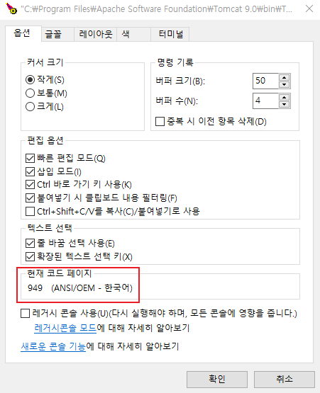 톰캣 콘솔의 인코딩이 949로 되어있음.