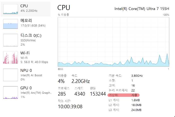 (작업관리자 > 성능 > CPU)