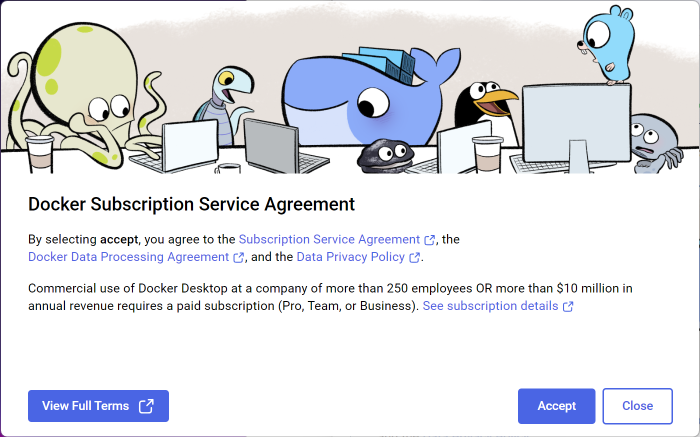 직원 수 250명 이상 또는 연매출 1천만 달러 이상인 회사에서 Docker Desktop을 업무용으로 사용할 경우 유료 요금제가 필요합니다.
