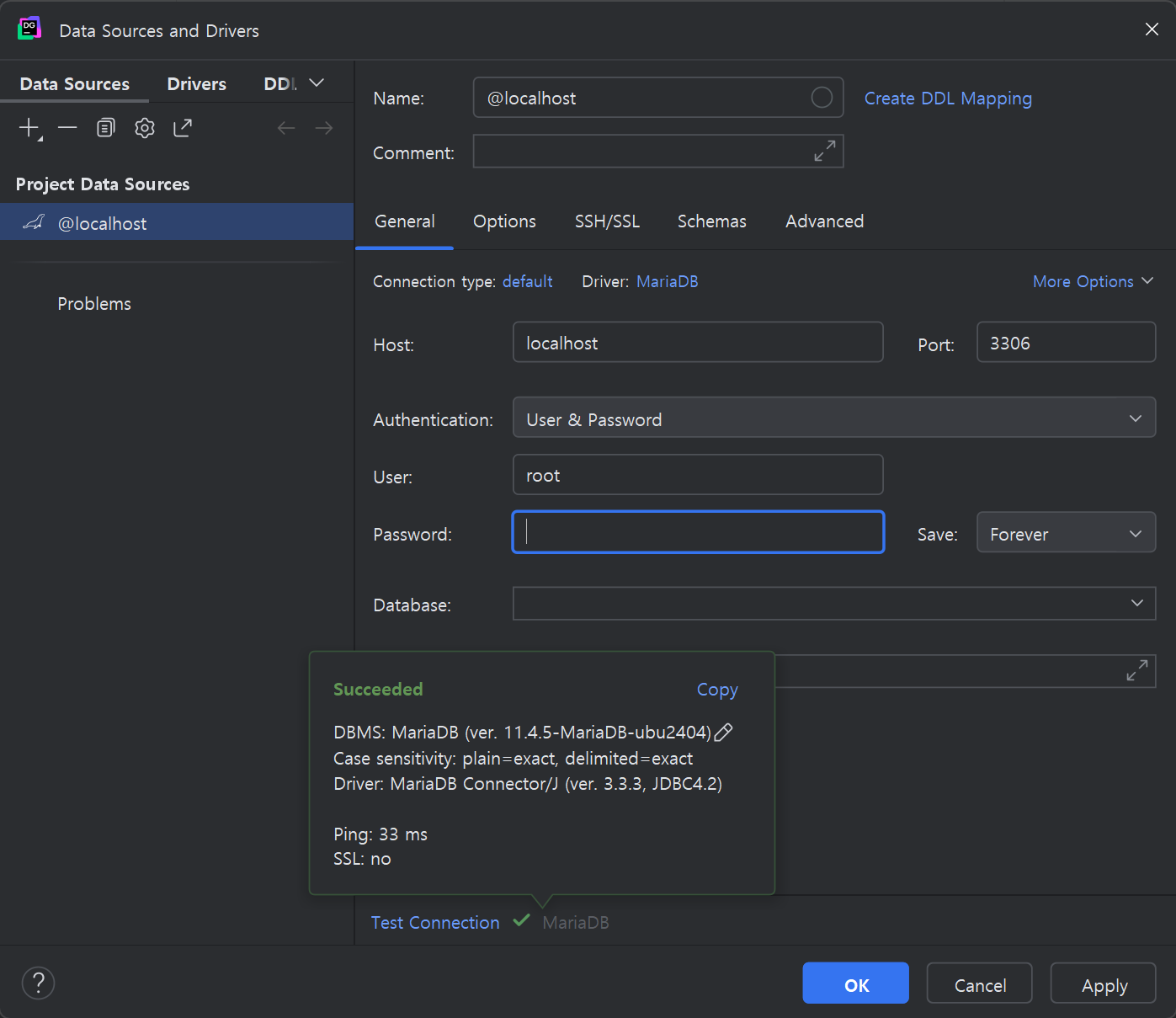 DataGrip에서 3306 포트 정상접근을 확인했다.