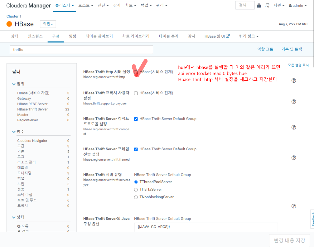 Cloudera Manager에서 HBase 구성 -> thrifts 검색