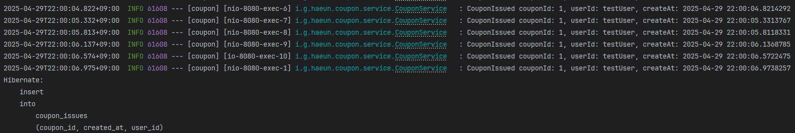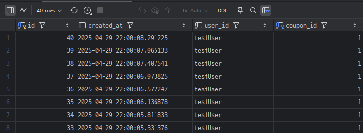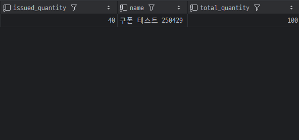 DB에서도 coupon_issues 테이블의 로우 개수 만큼 issued_quantity 의 값이 증가된걸 확인할 수 있었다.