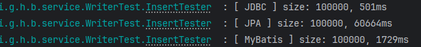 JDBC와 Mybatis를 보면 똑같이 10만개의 데이터를 values 로 처리하는 것을 확인할 수 있다. 근데 JDBC가 훨씬 빠른 이유는 뭔지 찾아봤다.
