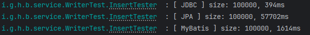 - 각 방식으로 동일한 데이터를 동일 조건으로 insert 테스트