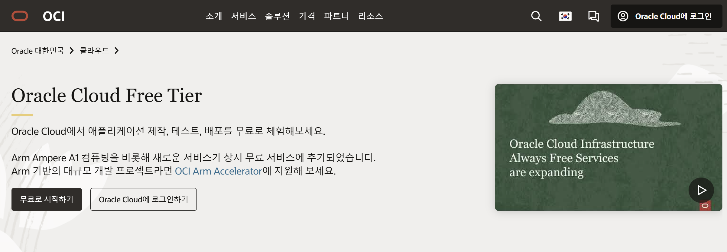 오라클 클라우드 무료 티어(Oracle Cloud Free Tier) 페이지에 접속해서 [무료로 시작하기]를 클릭하면 회원가입페이지로 넘어간다.