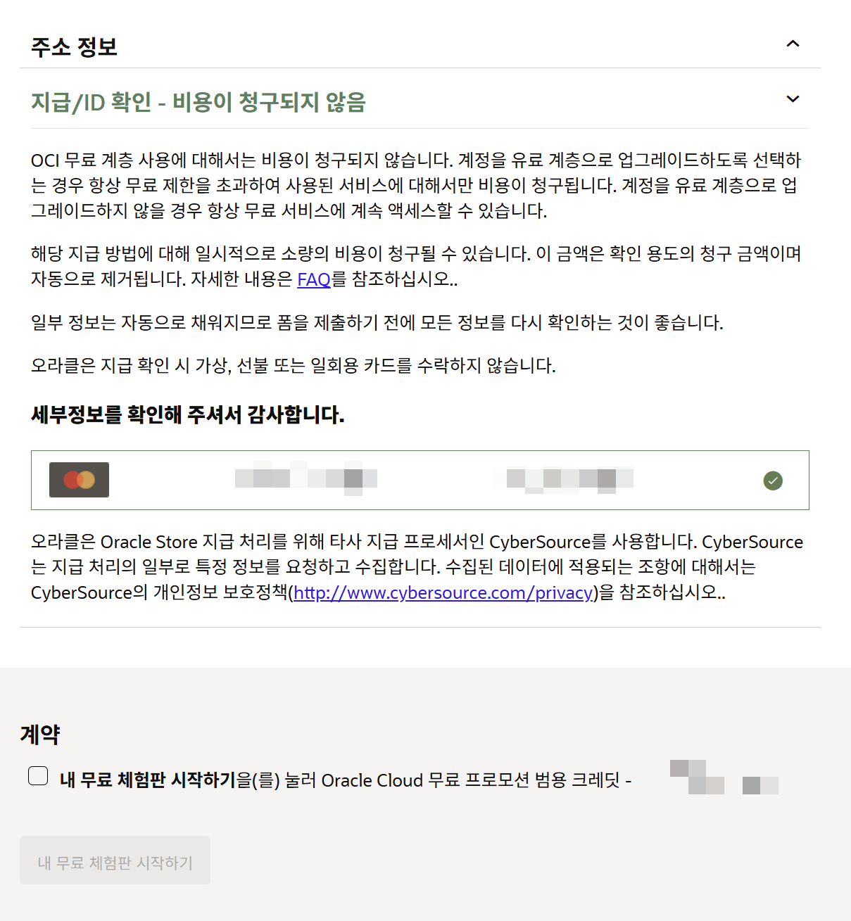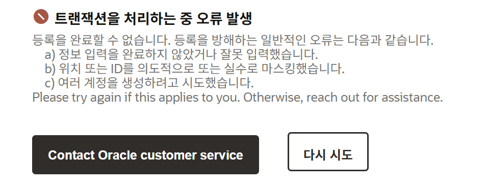 오라클 클라우드 무료 계층에 가입하려고 합니다. 다른 신용카드를 사용했는데 모든 정보가 올바른지 확인했습니다. 하지만 여전히 오류가 발생합니다: "거래를 처리하는 동안 오류가 발생했습니다."