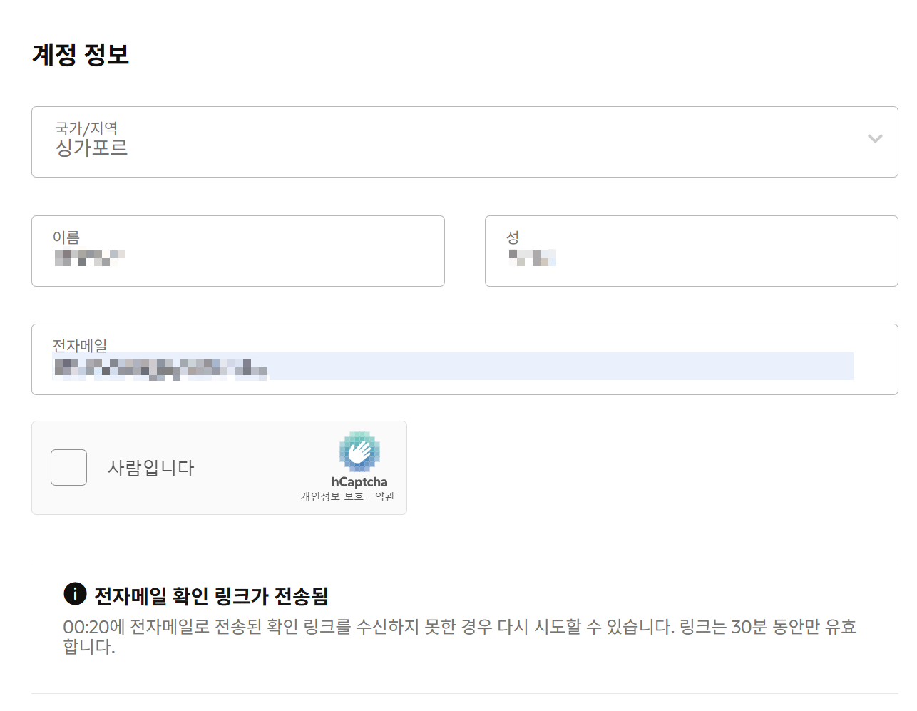 계정 정보(이름, 성, 전자메일)를 입력하고 이메일 인증을 한다. 이미지에서 '국가/지역'이 싱가포르로 되어있는데 region 설정을 착각했다. 여기서는 대한민국 선택해도 된다.