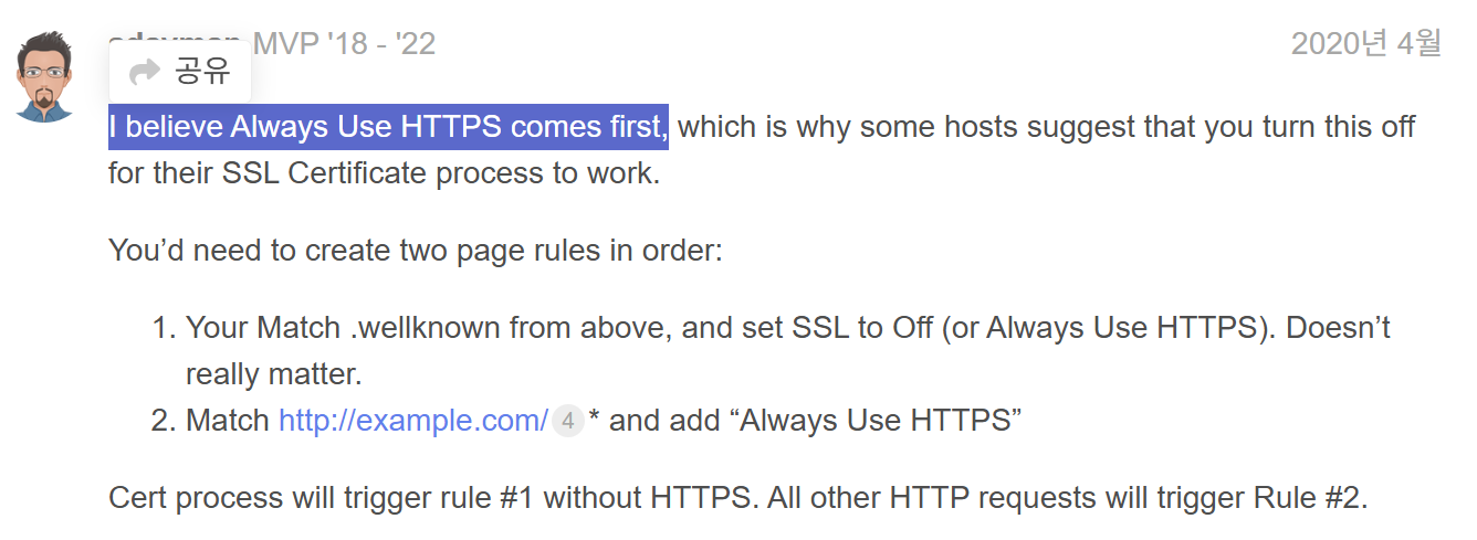- Cloudflare는 “Always Use HTTPS” 정책에 따라