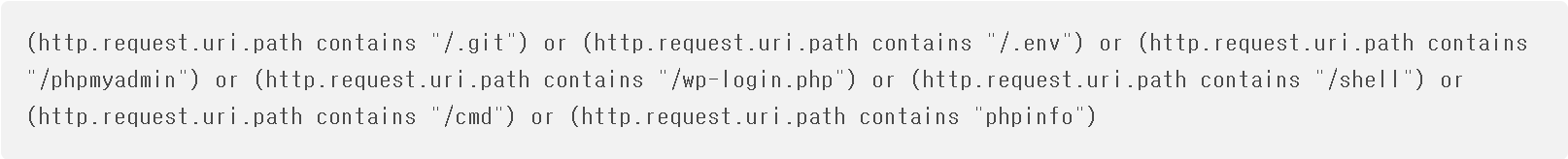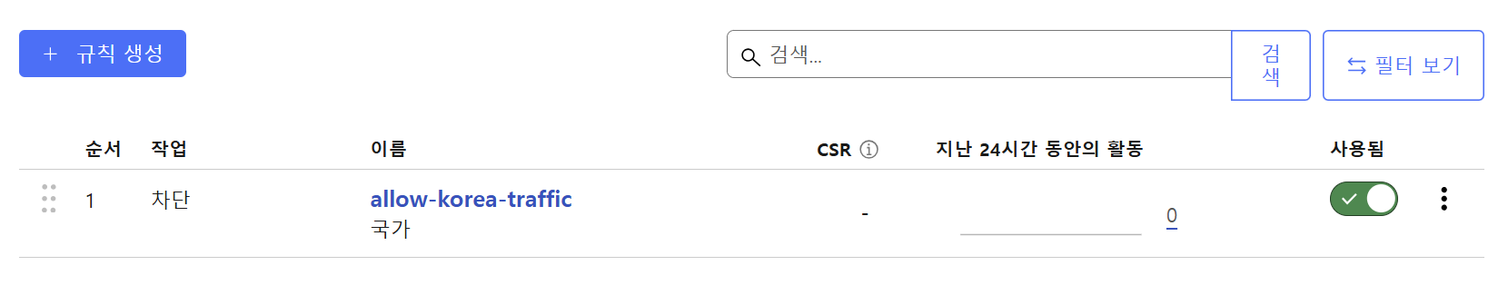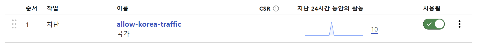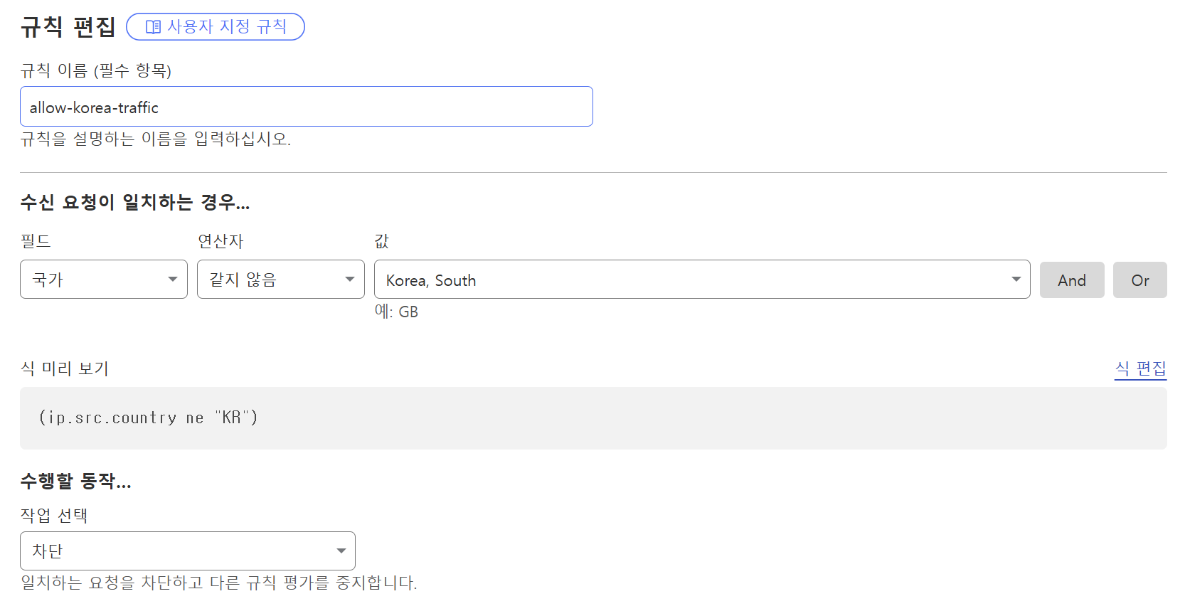 Cloudflare WAF에서 `ip.src.country ne "KR"`→ 차단(Block) 설정 시 KR(대한민국) 외 국가에서 들어오는 모든 요청을 차단합니다.