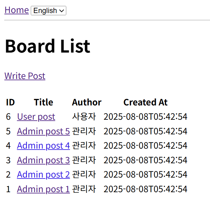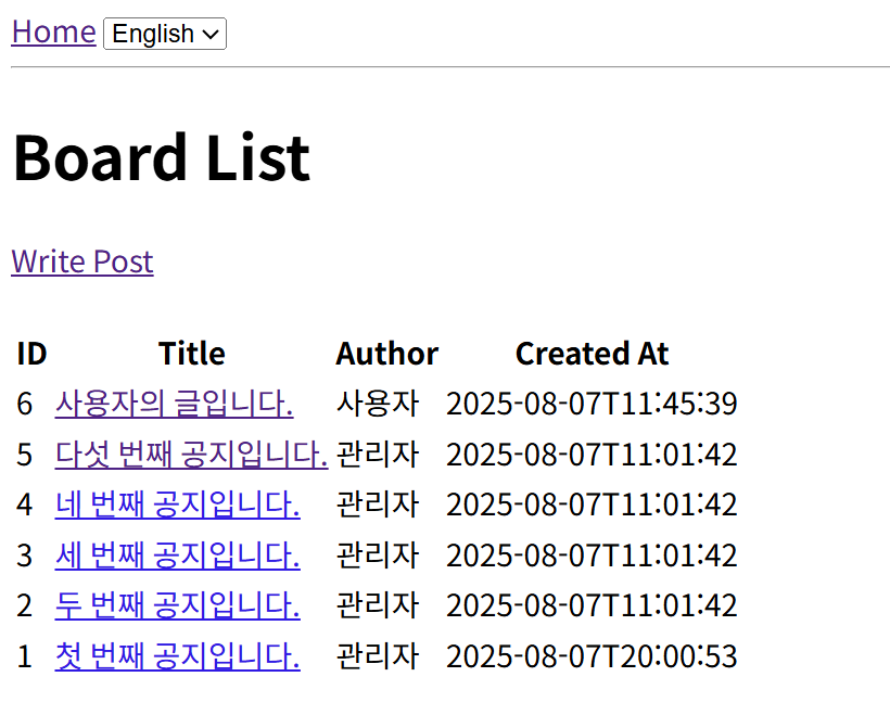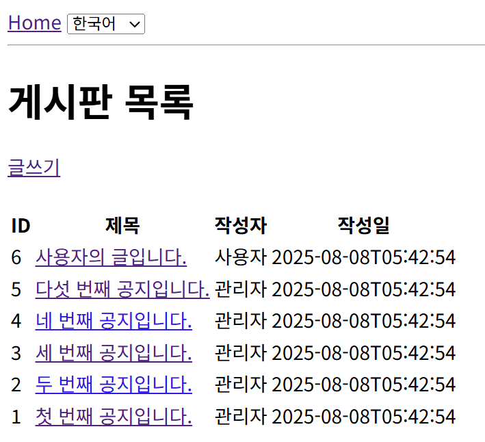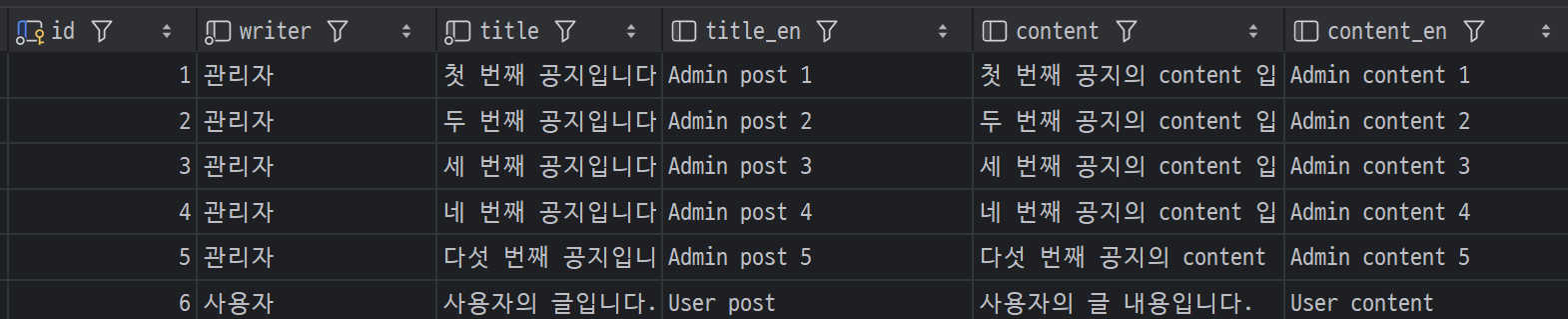 현재는 언어 변환만 하는 것이기 때문에 기본 테이블인 `board` 만 조회하고 있다. 언어별로 테이블을 생성해서 해당 테이블에 작성/조회/업데이트/삭제를 진행할 수 있도록 해봤다.