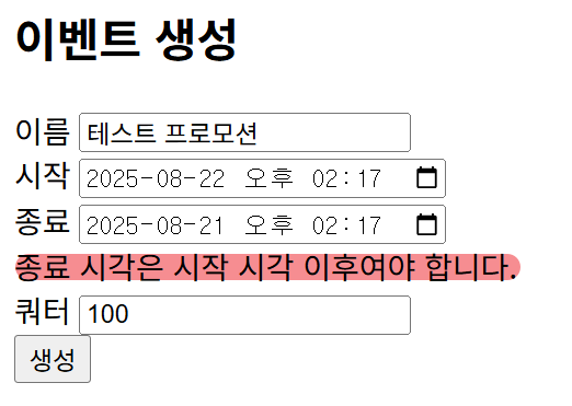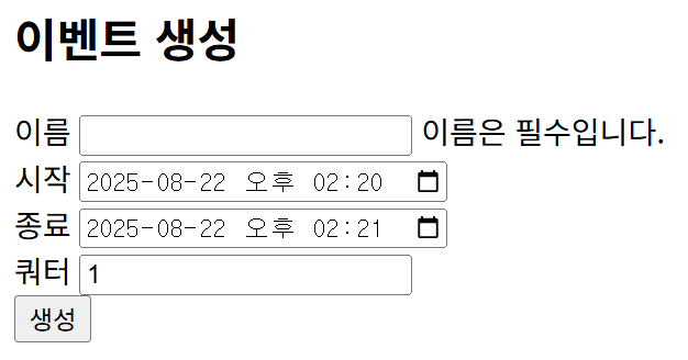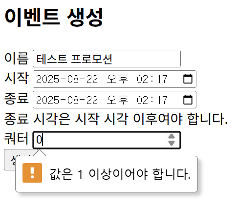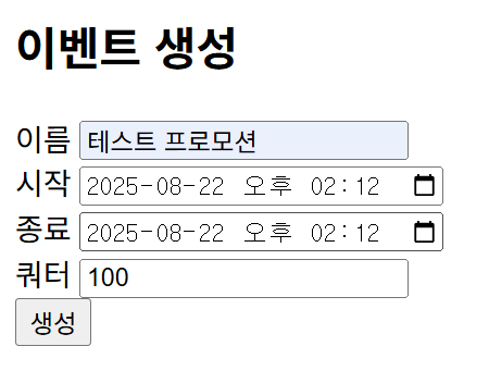 이름, 날짜, 쿠폰개수를 지정하여 이벤트를 생성할 수 있도록 했다. 쿼터는 쿠폰 개수로 나중에 몇 개의 쿠폰이 발급될지 따로 지정하지 않아도 이벤트 테이블 조회해서 사용할 수 있다.
